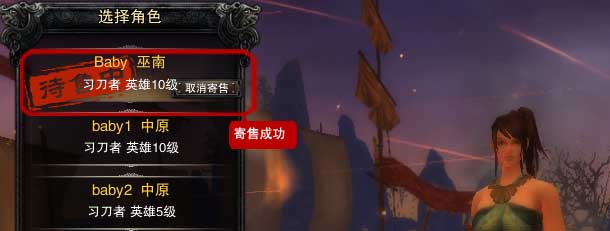 4、返回“游戏人物选择”界面,能看见待售中的角色,说明寄售成功。寄售成功后,系统会给结义、军团在线的人发送在线消息;对应夫妻、好友发送邮件。
