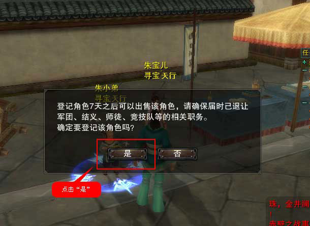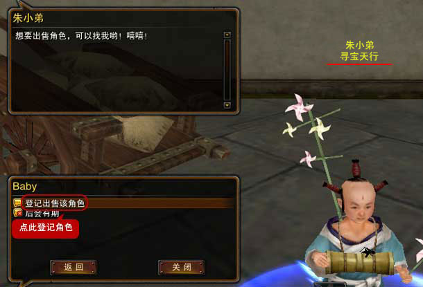 1、在游戏中,到“长安”找“朱小弟”(275,163)对话,选择“登记出售该角色。