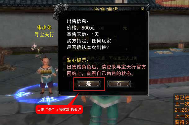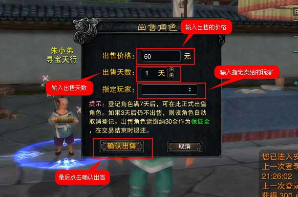 3、角色登记满7天后,再次与“朱小弟”对话,点击“出售角色”,填写“出售的价格”、“出售的天数”、“限定买家”等信息,点击“确认出售”按钮后角色进入寻宝天行公示期并冻结该角色无法登陆游戏,公示期为3天,出售期最长为