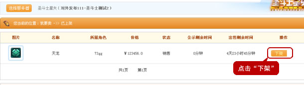 3、使用完美通行证登录寻宝天行,点击“我要卖”→“已上架”,找到正在寄售中的角色,点击“下架”,确定完成操作。