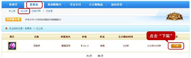 3、点击“我要卖”→“已上架”,找到正在寄售中的角色,点击“下架”,确定完成操作。