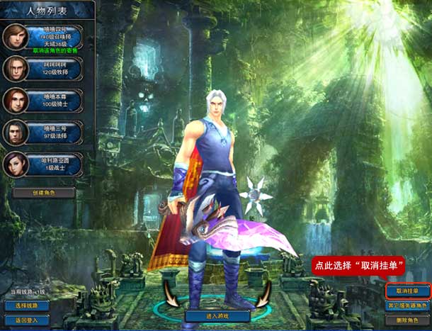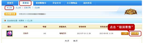 5、登陆《神鬼传奇》游戏客户端,选择已在寻宝天行下架的角色,点击“取消挂单”,提示“订单取消成功”,该角色即可正常登录游戏。取消寄售的角色保证金扣除不予返还。