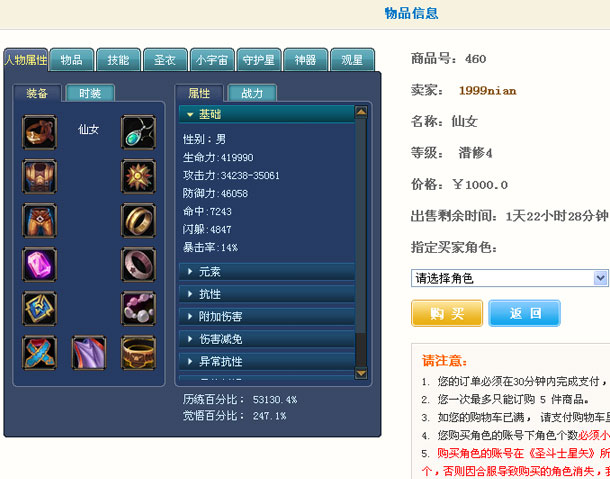 5、点击角色头像,查看已上架寄售的角色详细信息,以此来评估角色价值;若选中了要购买的角色后,单击“购买”按钮,进入付款流程。